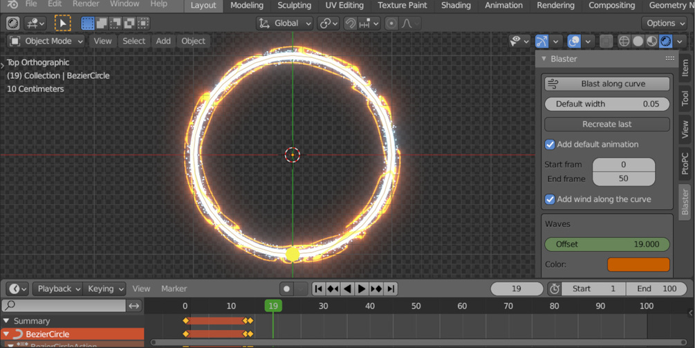 To create a blaster beam with default settings, just add a curve to the scene (shift + a - Curve), set the desired shape, and click the "Blast Along Curve" button in the addon panel.