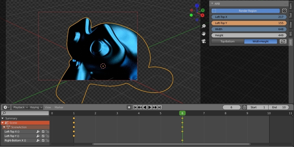 The coordinate values of the render border can be animated. To render the frames sequence with the animated render border coordinates, press the “Render Animation” button on the add-on panel.