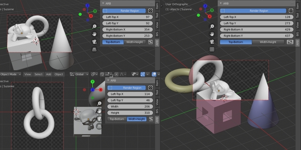 In each separate 3D-viewport area, the render border is controlled by the values from the separate add-on panel.